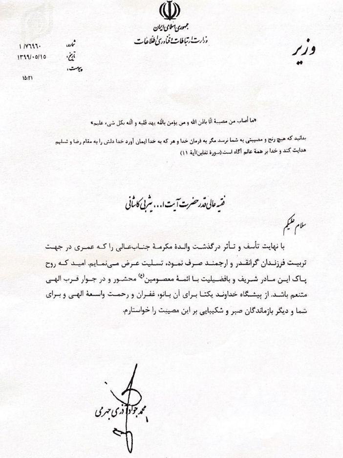 در پی درگذشت والده مکرمه آیت الله یثربی مدظله منتشر شد؛ پیام مکتوب تسلیت وزیر ارتباطات